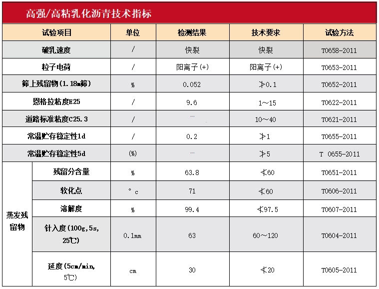 高強(qiáng)/高粘乳化瀝青是由特種改性瀝青(由高分子樹脂、彈性體橡膠、功能 性助劑及基質(zhì)瀝青經(jīng)過專用改性設(shè)備制備而成)通過專用膠體磨生產(chǎn)的一種水溶性的高性能材料,具有粘結(jié)強(qiáng)度高、粘度大、軟化點(diǎn)高、固化速度快等優(yōu)點(diǎn)。