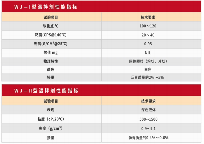 瀝青溫拌劑是新型聚烯烴類瀝青改性劑,具有一定降低施工溫度的作用,是 瀝青路面施工過程中重要的添加劑。 WJ 型溫拌劑能夠降低瀝青混合料的拌合和施 工溫度,同時WJ 型溫拌劑在瀝青中形成網(wǎng)狀的晶格結(jié)構(gòu),增加瀝青混合料的穩(wěn)定性,提高路面的抗車轍性能。